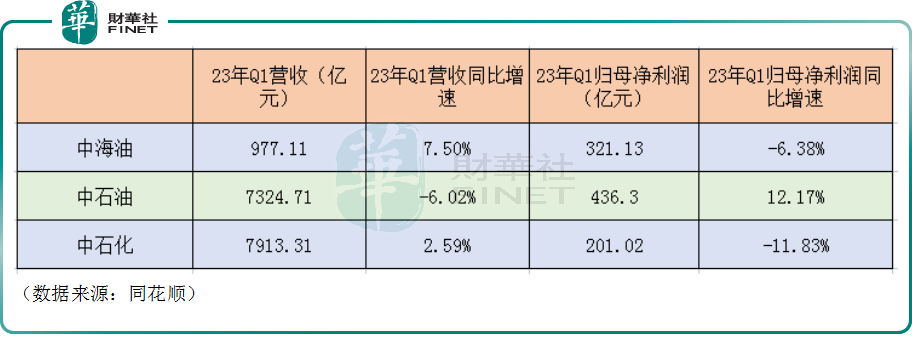 而在2023年一季度,中海油、中石化的归母净利润均遭遇了同比下滑,中石油的归母净利润则同比上涨12.17%至436.3亿元。