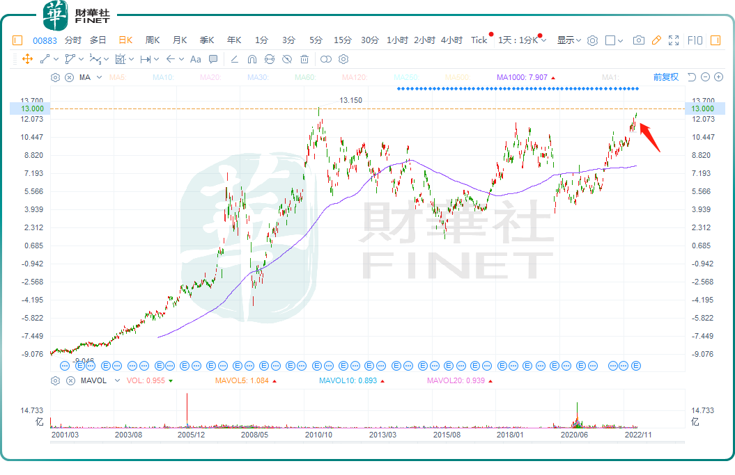 自2021年12月以来,中国海洋石油(00883.HK)迎来了一波上升期,至2023年5月8日