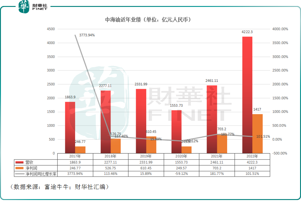 数据显示,2022年,中海油实现营收4222.3亿元(以下均指人民币),同比增长71.56%;
