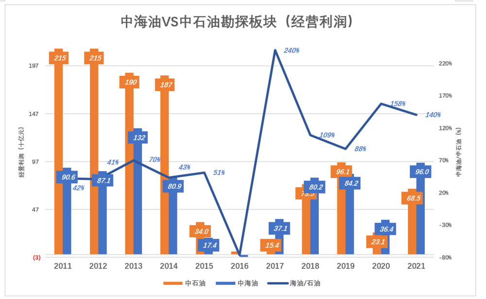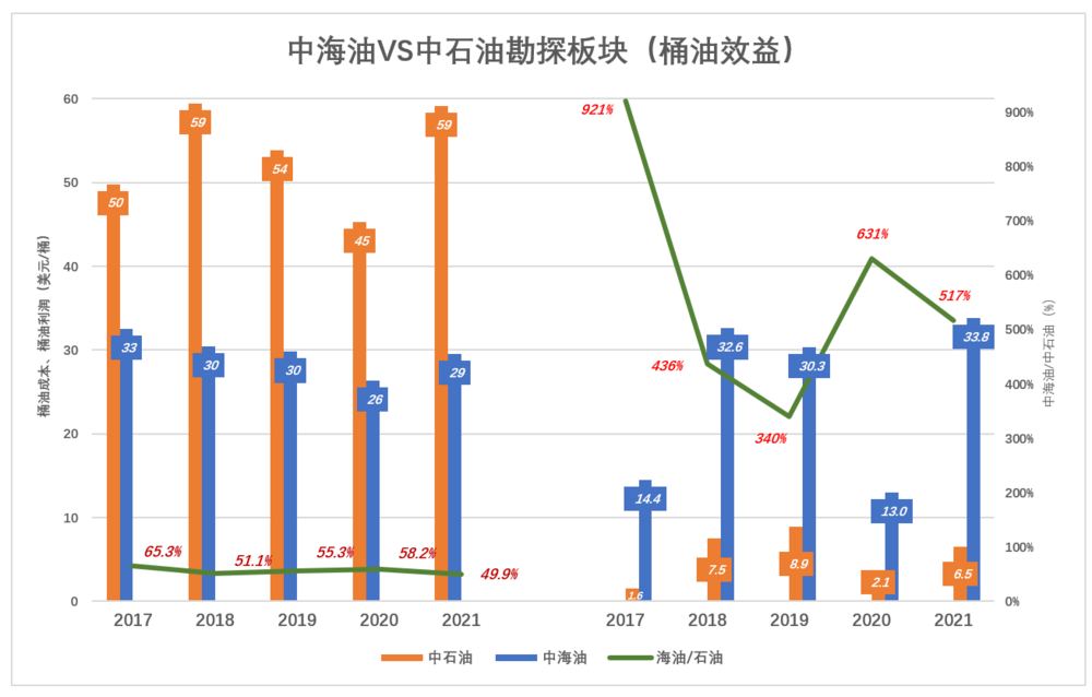 2021年中海油每桶经营利润是中石油勘探板块517%,2017年这个比例更是高达921%!