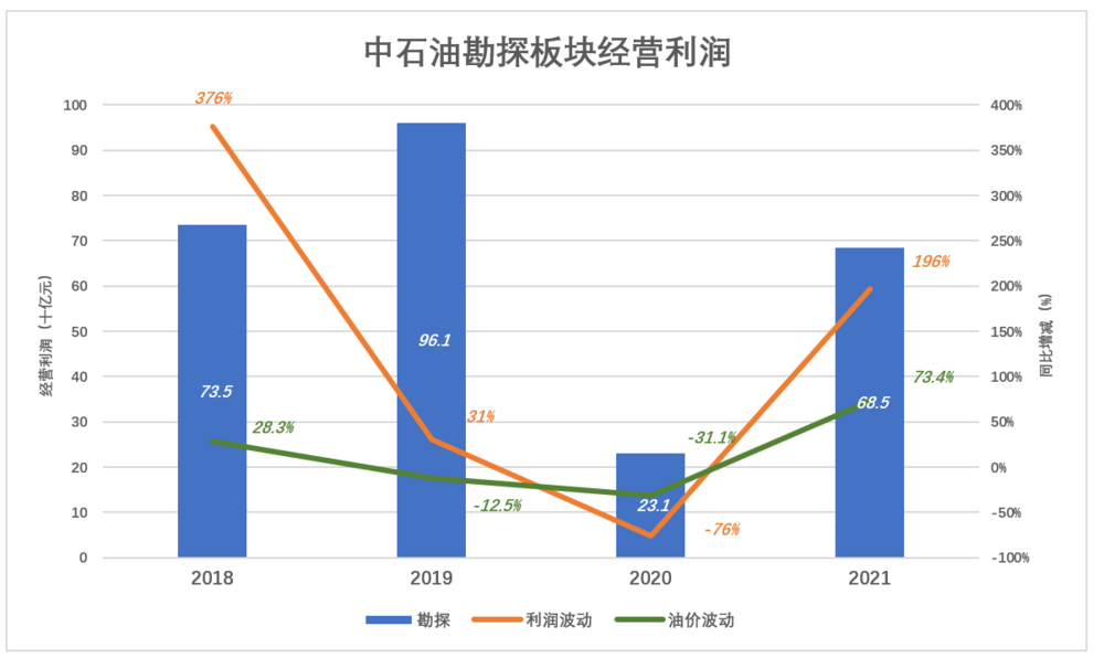 2018年,WTI现货年均价上涨28.3%、至65.2美元/桶,中石油勘探与生产板块经营利润大涨376%、至735.2亿;