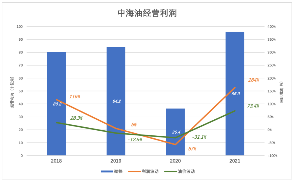 2020年,中海油经营利润降至364亿(比中石油勘探板块多133亿),同比下降57%(比中石油少跌19个百分点);