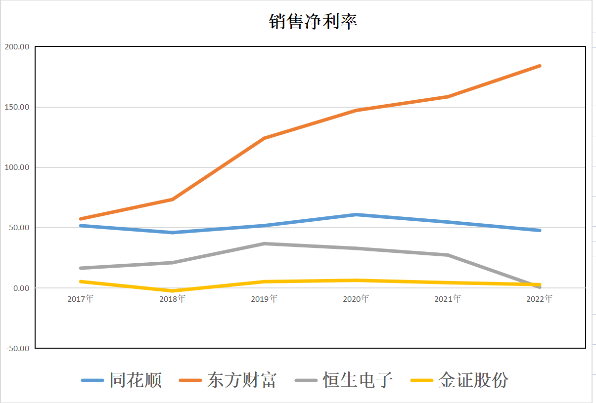,东财的销售净利率自2017年50%一路上升到2022年的183%,净利润竟然接近营收的两倍,简直令人叹为观止。
