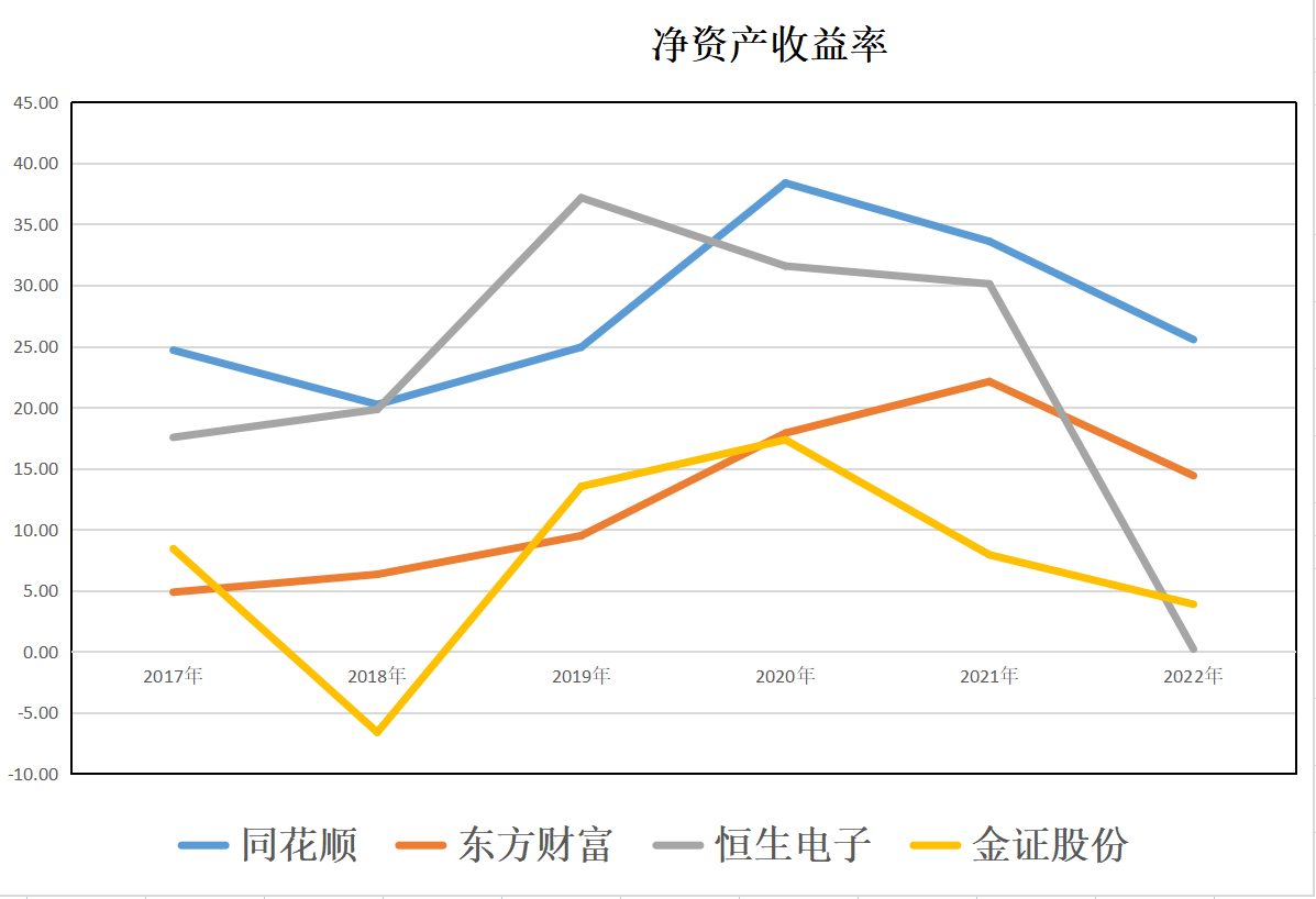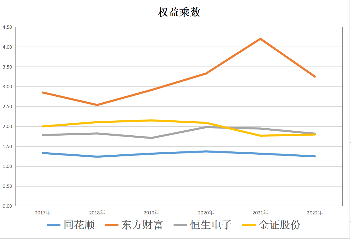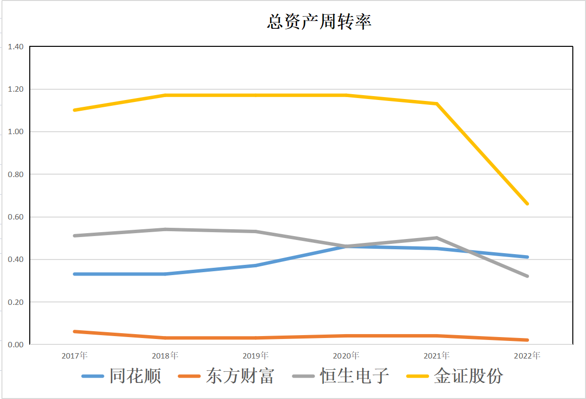 这意味着,类似于东方财富、同花顺、恒生电子此类公司是利润高,但业务营收体量相对于自己的总资产较小,资产运营效率低,属于厚利少销型,