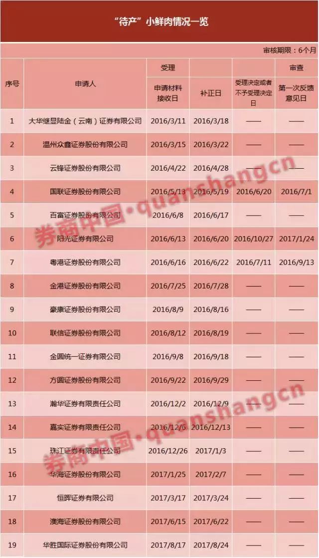 券商中国记者据证监会网站的公开信息显示,截至11月24日,向证监会申请设立的19家“待产”券商分别是大华继显陆金(云南)证券、温州众鑫证券、云锋证券、国联证券、百富证券、阳光证券、粤港证券、金港证券、豪康证券、联信证券、金圆统一证券、方圆证券、瀚华证券、嘉实证券、珠江证券、华海证券、恒晖证券、澳海证券、华胜国际证券。