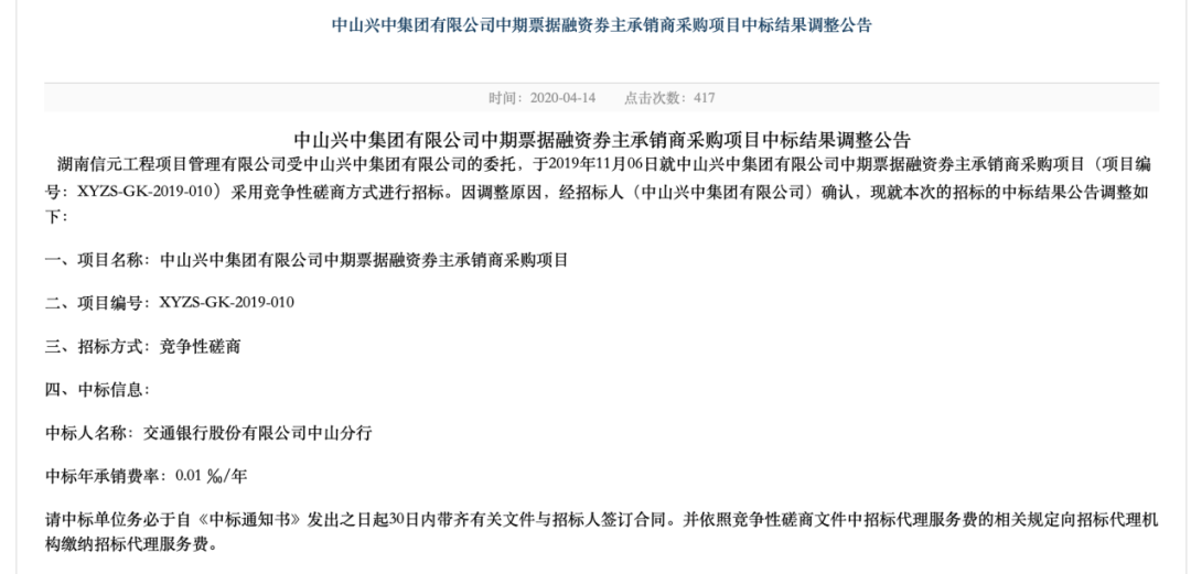 券商中国记者查阅数据发现,有银行曾给出十万分之一。4月14日,中山兴中集团有限公司中期票据融资券主承销商采购项目中标结果发布调整公告,中标人为交通银行中山分行,中标承销费率0.01‰。