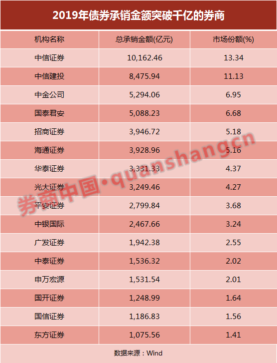 根据Wind对2019年债券承销规模的统计,上述提及的券商均突破千亿。