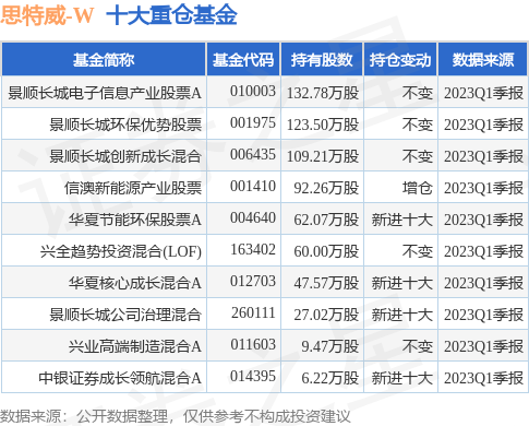 根据2023Q1季报公募基金重仓股数据,重仓该股的公募基金共11家,其中持有数量最多的公募基金为景顺长城电子信息产业股票A。景顺长城电子信息产业股票A目前规模为29.39亿元,最新净值1.1676(7月10日),较上一交易日下跌0.46%,近一年上涨5.47%。该公募基金现任基金经理为杨锐文 张雪薇。杨锐文在任的基金产品包括:景顺长城优选混合,管理时间为2014年10月25日至今,期间收益率为238.89%;景顺长城环保优势股票,管理时间为2016年3月15日至今,期间收益率为210.6%;景顺长城创新成长混合,管理时间为2019年10月17日至今,期间收益率为57.75%;景顺长城成长领航混合,管理时间为2020年5月28日至今,期间收益率为25.35%。张雪薇在任的基金产品包括:景顺长城研究精选股票,管理时间为2023年5月13日至今,期间收益率为9.93%。