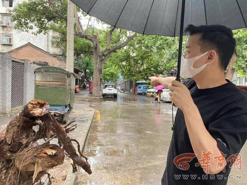 7月22日上午,华商报记者在建国三巷附近见到了孙先生。在现场,结合孙先生的照片、视频显示,事发当天,距离他车子西侧20米左右的一棵梧桐树向东侧倒下,多根树干落在车上,车的后挡风玻璃、车顶、后备箱盖等处均被损伤。