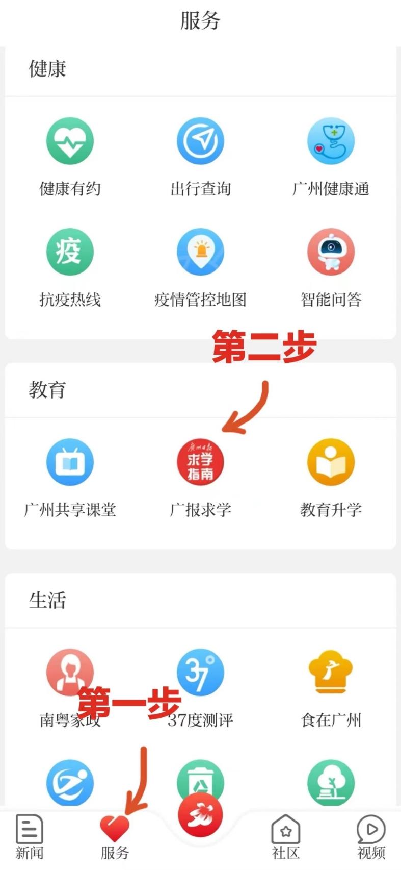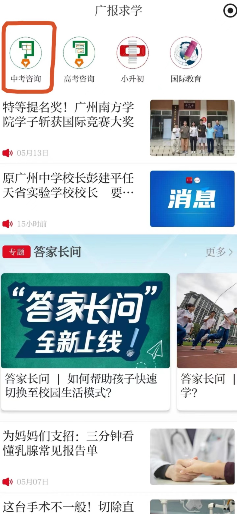2.点击首页下方“服务”板块中,下拉到“教育”栏,找到并点击“广报求学”,再点击“中考咨询”,即可进入咨询页面。
