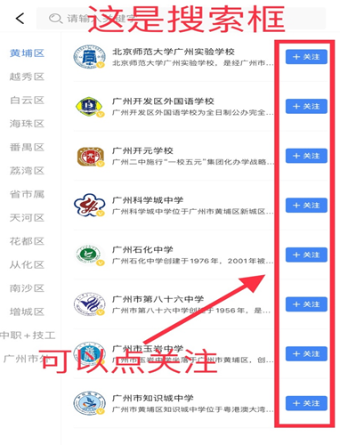 3.在咨询页面,可按照学校所属类别(省市属、广州11区、中职、技工等)查找,或在搜索框搜索学校名称。点击对应学校一栏右方的“+关注”,即可进入该校页面。