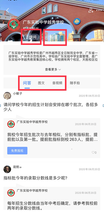 4.在学校页面,点击上方“提问”或“私信”,即可进行在线咨询。同时也可通过图文和音视频等栏目了解学校。