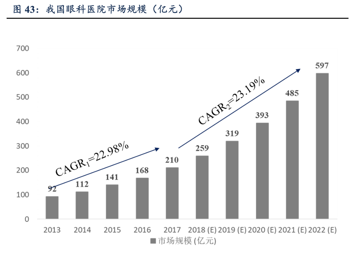 2017年眼科医院市场规模为210亿元,2013-2017年复合增长率为23.19%。我国眼科市场较大,增速仍然较快,未来增长可期。