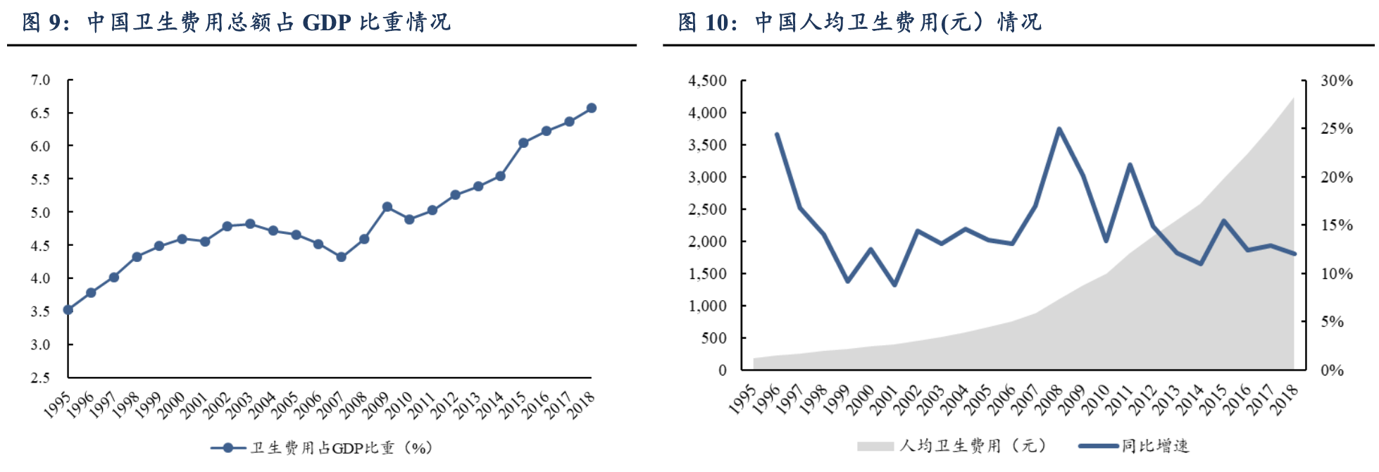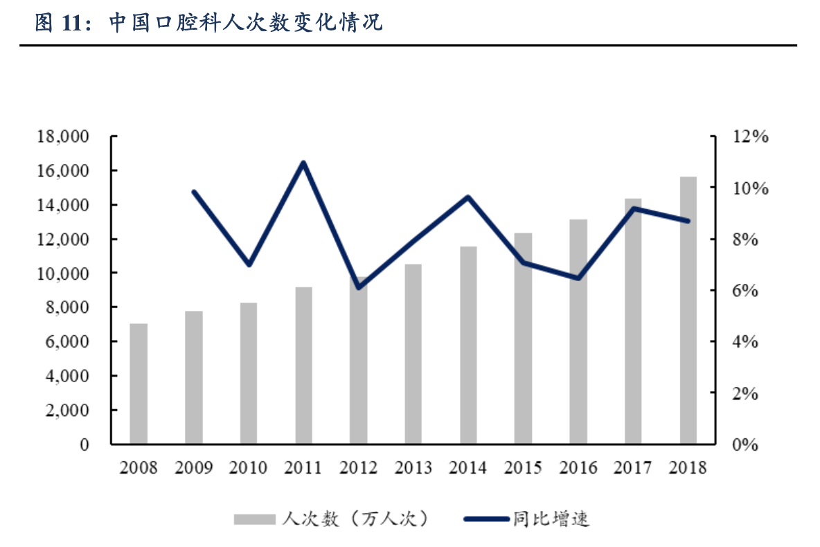 随着近年来我国经济的发展和居民对医疗卫生健康意识的逐步提升。可以看出,随着国民健康意识的逐渐加强,我国卫生费用总额占GDP的比重逐年加强且上升趋势明显。而人均卫生费用也呈现逐年上市的趋势,2018年人均卫生费用达4237元,同比增长12%。随着我国居民整体医疗健康意识和经济水平的提升,我们认为定期的口腔检查、洗牙、口腔日常护理等将更为普遍,牙科市场整体向好。