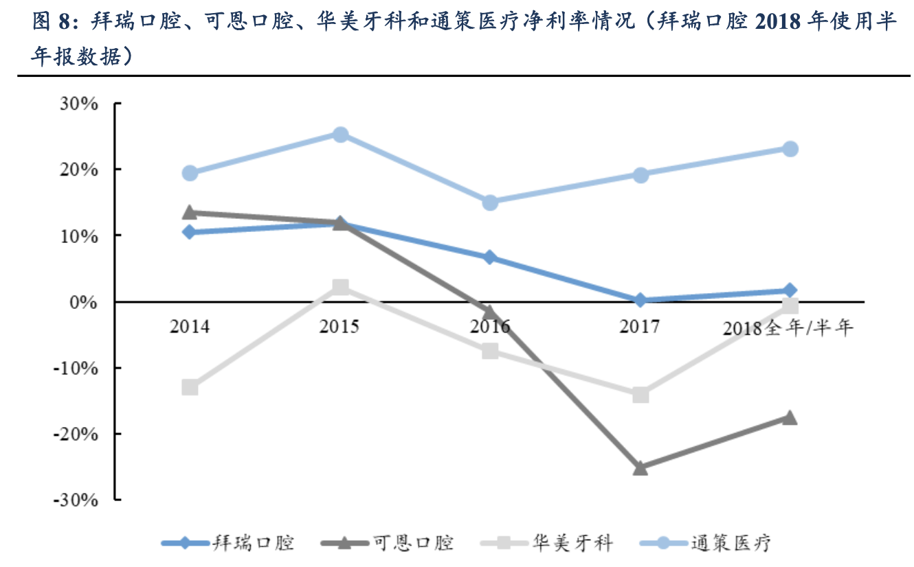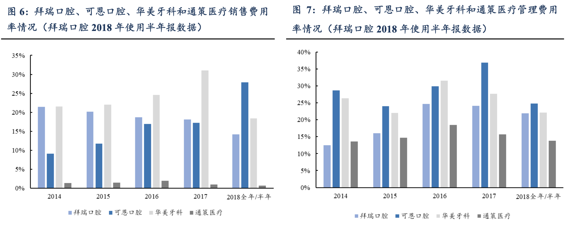 对比其它同类口腔医疗服务的企业,我们发现公司无论从销售费用率还是管理费用率,均处于较高水平。我们认为,公司销售费用率较低的主要原因为:公司收购的杭口、宁口等大型口腔医院,收购之初在当地已经享有较好的口碑,是在当地属于排名在前三的大型口腔专科医院。这类医院有较好的声誉和医生资源,因此获客成本极低,对公司宣传、推广的需求不高,从而带来了较低的销售费用率。