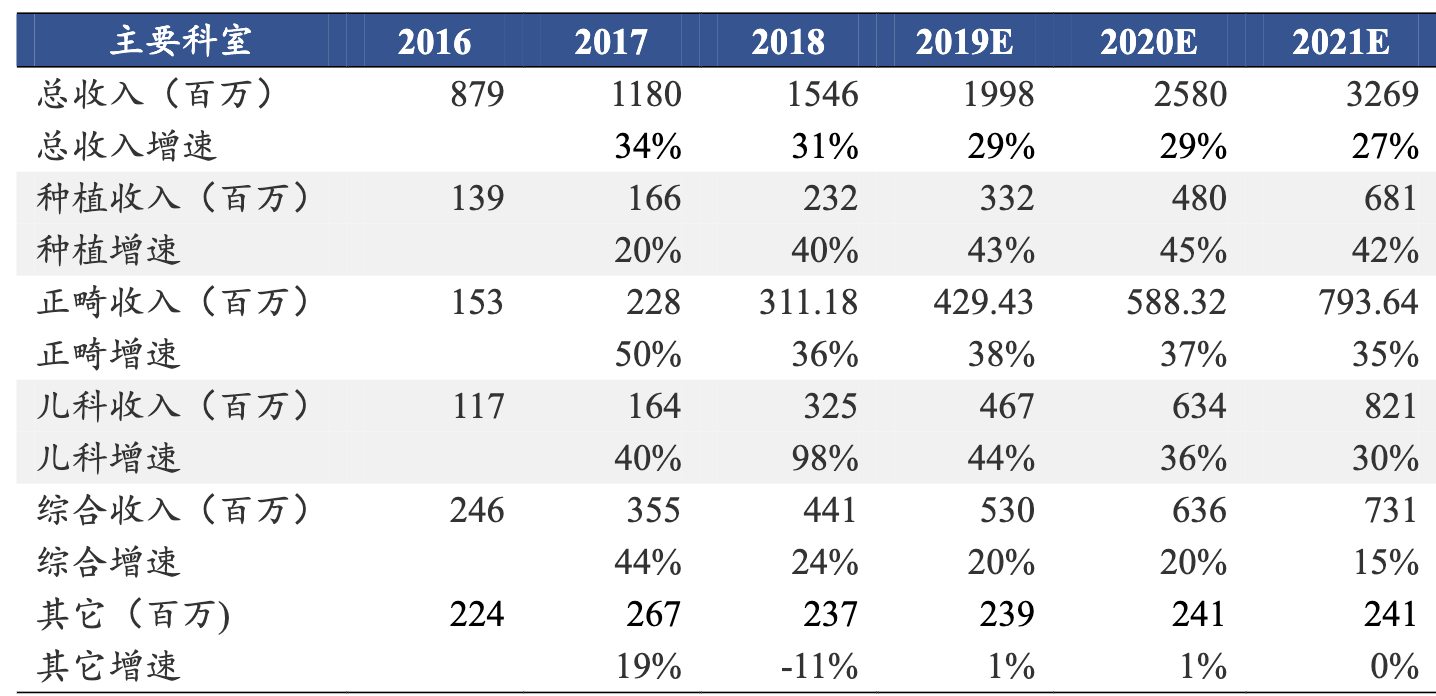 认为公司种植牙齿收入在公司现有医院中将继续维持快速增长,2019年至2021年增速有望维持在40%以上。正畸行业整体向好,公司该板块业务2017年和2018年均实现快速增长。我们认为随着公司总院的医疗资源向分院不断输出,资源进一步下层,未来该板块业务将继续维持35%或以上的增速。儿科2018年收入端实现快速增长,增速达到98%;综合收入2018年实现增速24%,增长稳定。考虑公司现有医院承载能力有限,且公司未来将把重心放在种植牙与正畸业务板块,未来儿科与综合的收入增速将有所放缓。整体来看,公司种植牙与正畸板块增速较快,其它板块增长稳定,2019-2021年公司整体收入增长将继续维持稳定。
