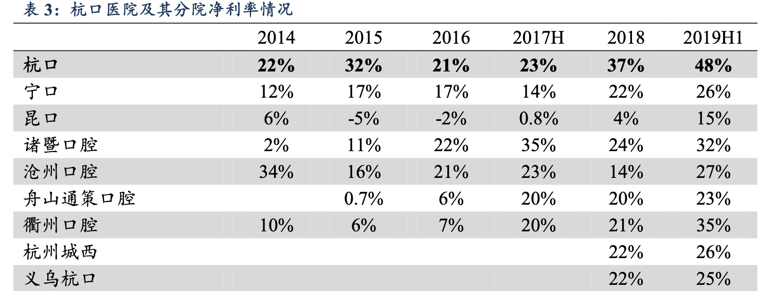 仍然较大杭口总院和其它各家口腔医院的效率均在逐年提升,但截至2019年半年报,可以看出其它医院与杭口医院的效率仍有较大差距。如果各个分院的净利率达到杭口总院的水平,我们认为其将为公司贡献较大的利润弹性。