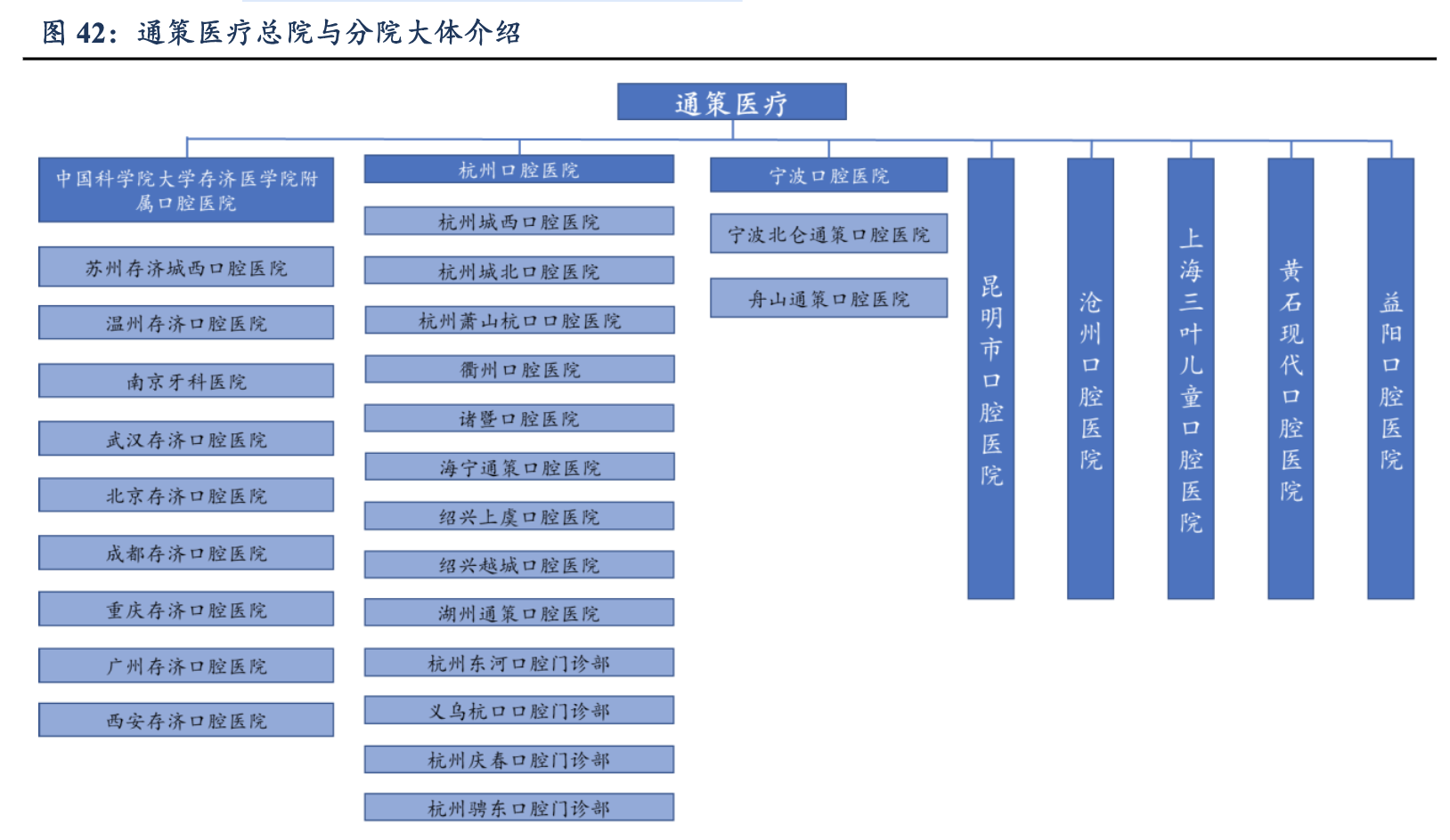 公司通过设立分院向周边地区扩张,总院为分院提供技术支持。新开设的分院按照杭口集团持股51%及以上比例,当地医生团队持股比例30~40%的方式规划设立。上述持股比例,既可保障公司的控股权,亦可进一步增加当地医生团队的利益捆绑,从而带来更强的医生粘性。同时,该持股比例相对降低了公司的支出成本,提高公司的收益比例。随着总院+分院模式的推广,公司口腔医院得以快速发展。公司目前已有分院的总院包括中国科学院大学存济医学院附属口腔医院、杭口医院和宁口医院。同时公司设立了昆明市口腔医院、沧州口腔医院、上海三叶儿童口腔医院、黄石现代口腔医院和益阳口腔医院,为接下来的扩张做准备。
