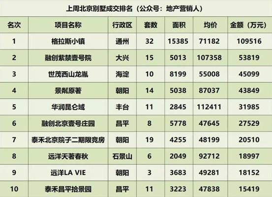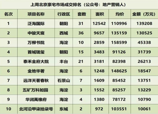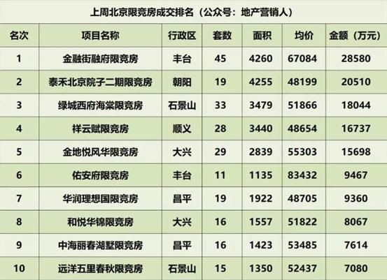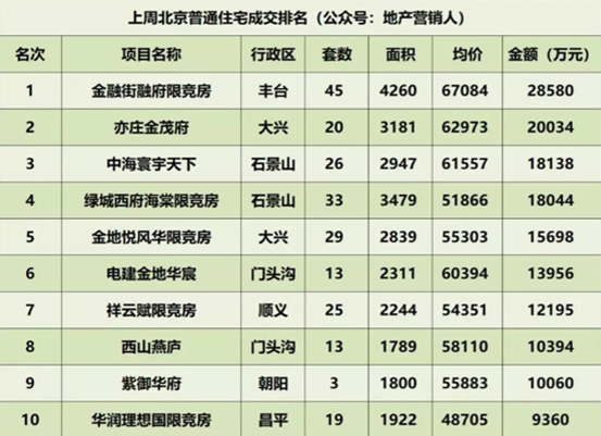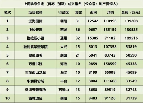 根据地产营销人公众号数据显示,上周(12月17日—12月23日)北京市商品房成交1335套,环比下降1%;成交面积28.97万㎡,环比上涨33%;成交均价62001元/㎡,环比上涨15%;成交金额179.62亿元,环比上涨54%。以下是上周北京楼市具体成交情况。