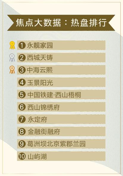 搜狐焦点大数据显示,在上周(12月17日—12月23日)新房热度排行榜中,永靓家园、西城天铸、中海云熙分别位列榜单前三甲,玉景阳光、中国铁建·西山梧桐入围榜单前五强;而榜单第六至十名分别为西山锦绣府、永定府、金融街融府、葛洲坝北京紫郡兰园、山屿湖。