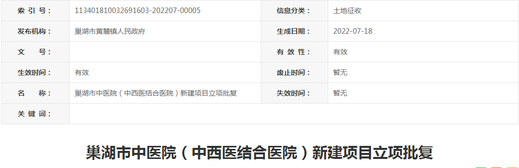 巢湖市中医院(中西医结合医院)项目位于黄麓镇境内,东至塔山路、南至半岛大道、西至农田、北至老烔中路。项目总建筑面积6.35万平方米,其中地上建筑面积5.05万平方米,地下建筑面积1.3万平方米。项目主要建设设置500张床位的综合医疗中心和设置200张床位的康养中心,并购置相关医疗设备。