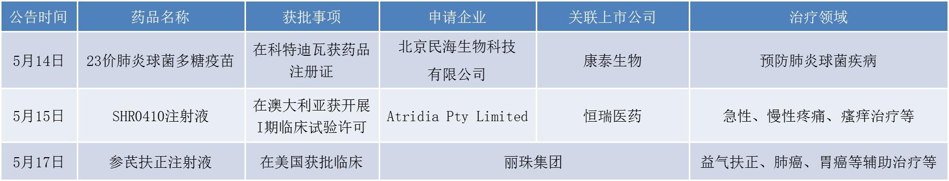 本周(5月13日至5月19日)药企扩张势头持续高涨,步长制药(603858.SH)、润达医疗(603108.SZ)等企业在国内收购如火如荼,金达威(002626.SZ)、亿帆医药(002019.SZ)则把目光瞄向了海外。此外,依靠健胃消食片而知名的江中药业(600750.SH)控股股东股权改革进一步深化,其实控人将变更为医药商业龙头华润医药(03320.HK)。在研发方面,多家企业产品获得药品注册和临床批件,其中不乏多个创新药;恒瑞医药(600276.SH)制剂出海又迎收获,安科生物(300009.SZ)、华兰生物(002007.SZ)等多家企业产品即将生产上市;德展健康(000813.SZ)的核心品种阿乐成为首个通过一致性评价的阿托伐他汀类药物,对辉瑞原研药的进口替代有望加速。