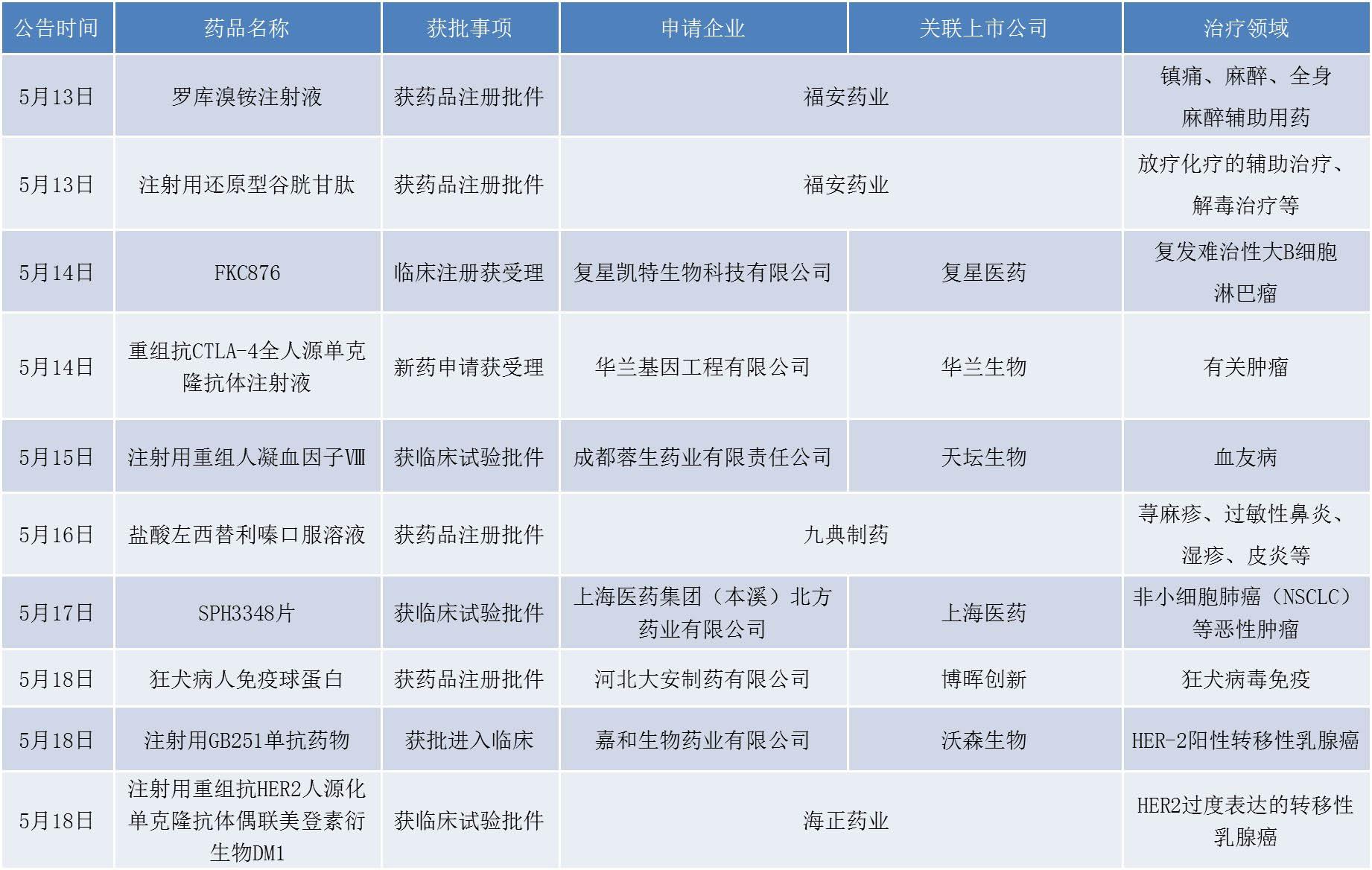 细胞免疫治疗产品的引进也取得突破。5月14日晚,复星医药(600196.SH)称投资的复星凯特用于复发难治性大B细胞淋巴瘤治疗的FKC876产品获国家食药监总局临床试验注册审评受理;该产品即美国生物科技公司Kite Pharma的细胞免疫治疗产品Yescarta(2017年10月获美国FDA批准于美国上市),由复星凯特从Kite Pharma引进。这意味着复星医药在,目前尚无与该产品具有相同靶点的同类药物在中国境内(不包括港澳台地区)上市。