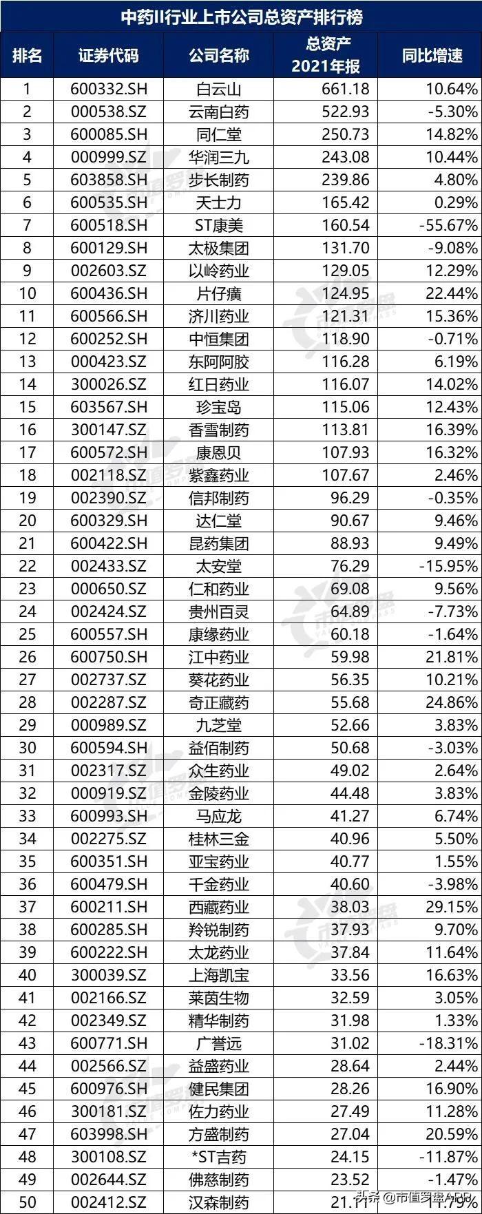 其中,2家中国中药II上市公司总资产规模超过500亿。榜单前三发生改变,白云山(661.18亿元)保持排名第一,云南白药(522.93亿元)保持排名第二,同仁堂(250.73亿元)代替ST康美排名第三。
