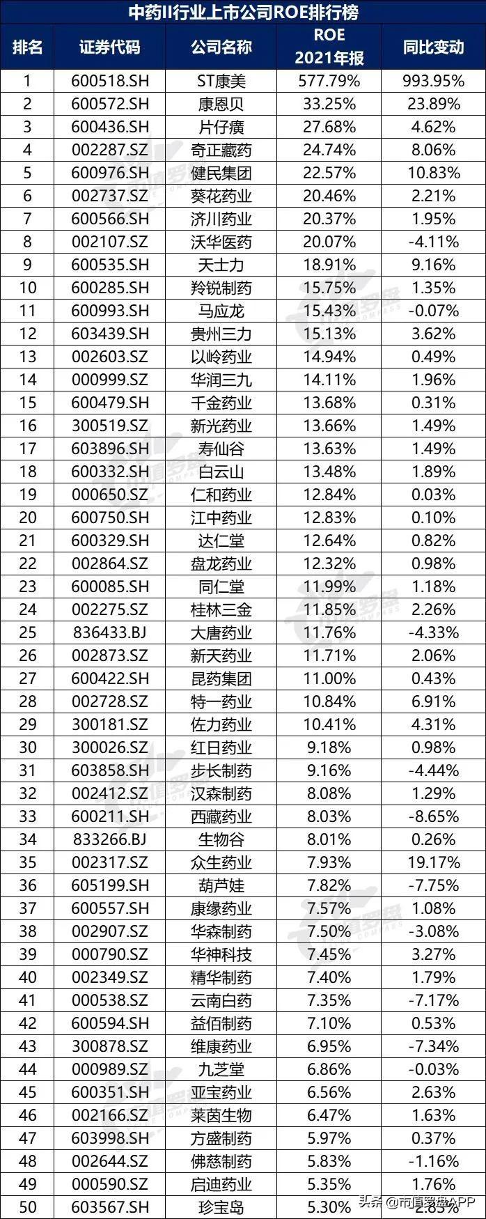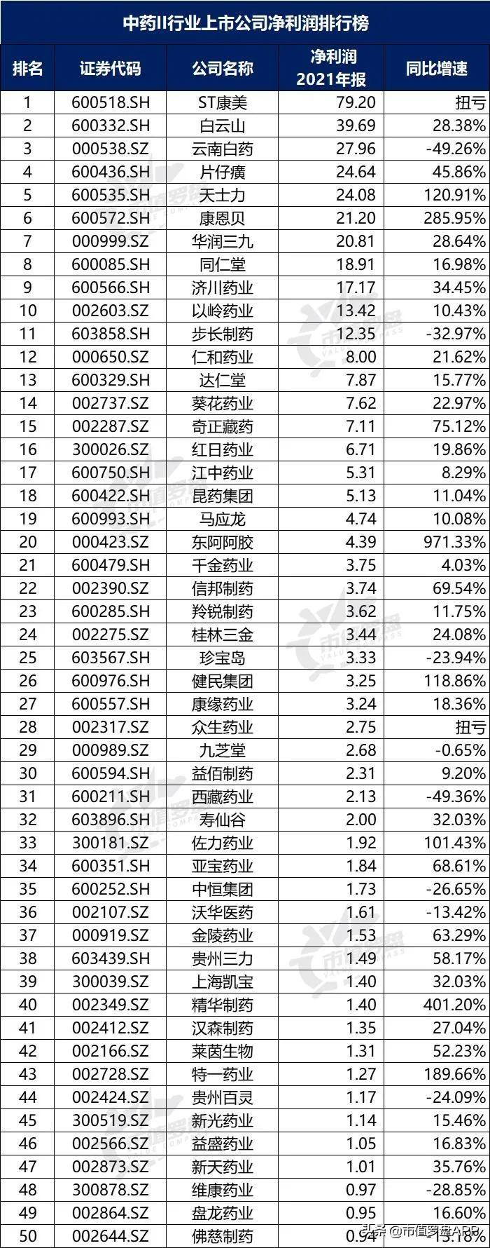 其中,1家企业净利润规模突破50亿元,11家企业亏损。榜单前三未发生改变。2021年净利润第一名是ST康美(79.20亿元),第二名是白云山(39.69亿元),第三名是云南白药(27.96亿元)。