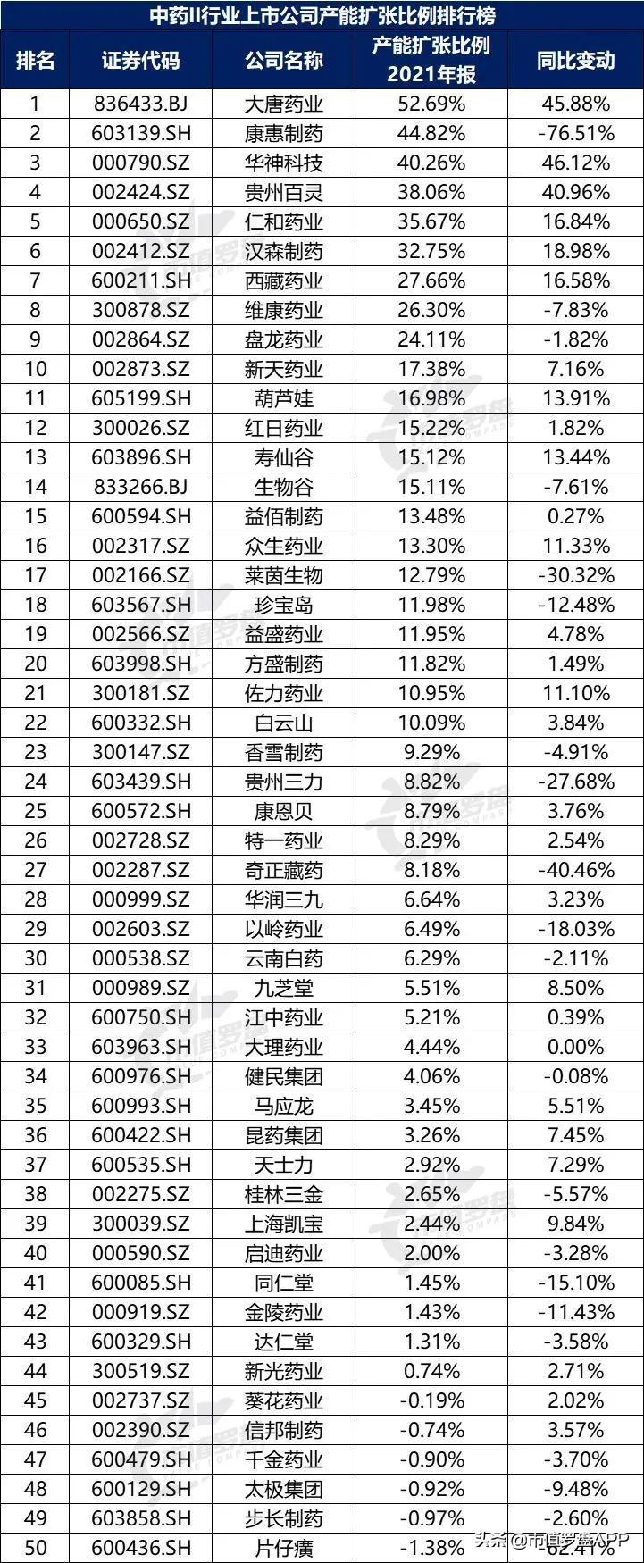 2021年中国中药II上市公司中没有公司产能扩展比例大于100%。榜单前三发生改变,大唐药业(52.69%)代替康惠制药排名第一,康惠制药(44.82%)排名第二,华神科技(40.26%)代替奇正藏药排名第三。
