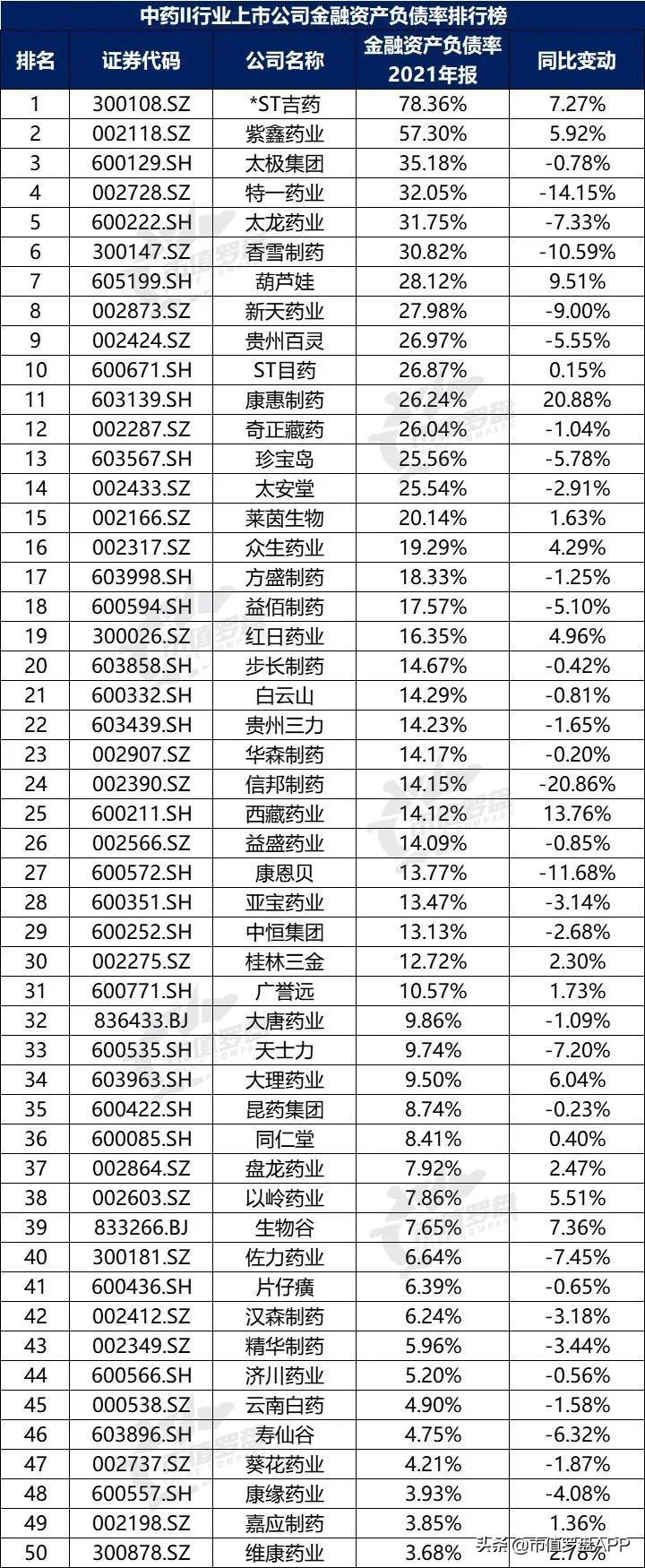 2021年中国中药II上市公司2家金融资产负债率高于50%,金融负债占比较高,偿债压力较大。榜单前三发生改变,*ST吉药(78.36%)代替ST康美排名第一,紫鑫药业(57.30%)排名第二,太极集团(35.18%)代替紫鑫药业排名第三。较去年同期,26家公司金融负债率增加,45家公司金融负债率减少。