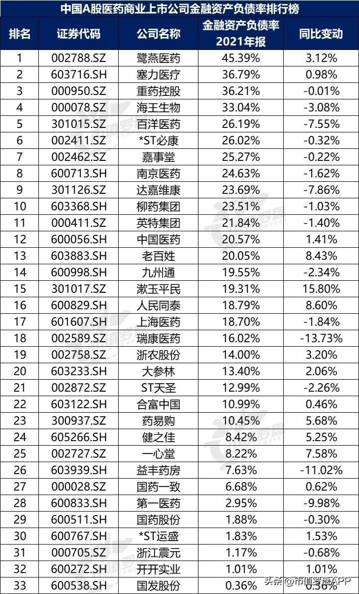 图19:中国A股医药商业上市公司金融资产负债率排行榜