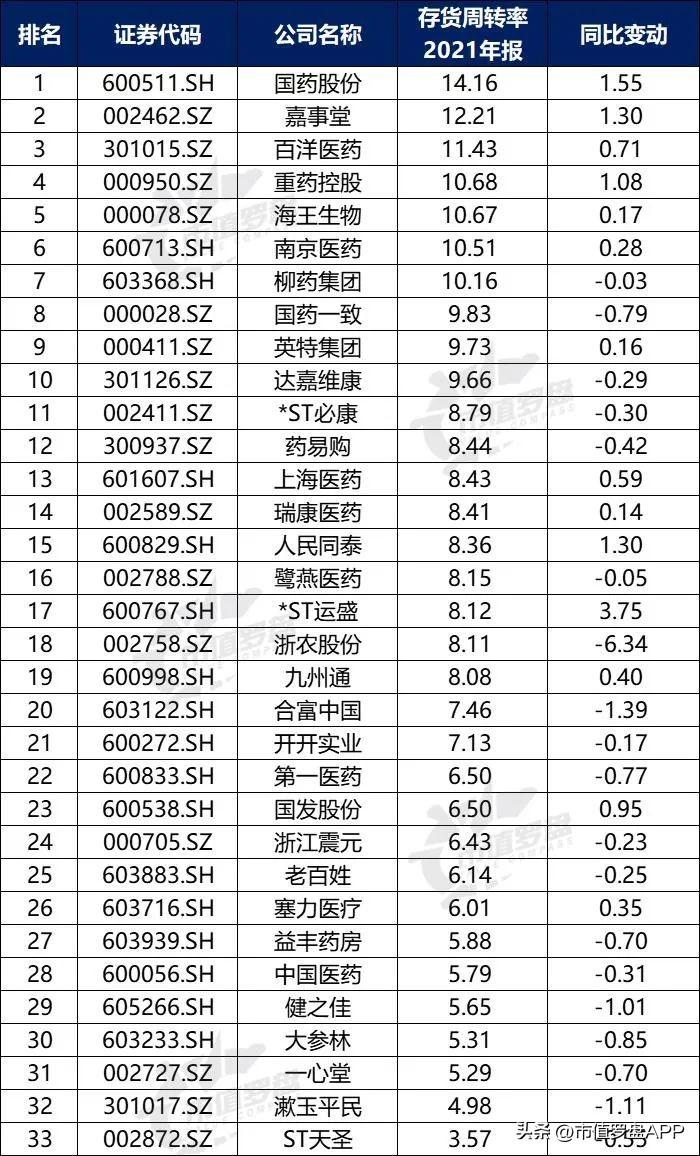 图13-2:中国A股医药商业上市公司存货周转率排行榜