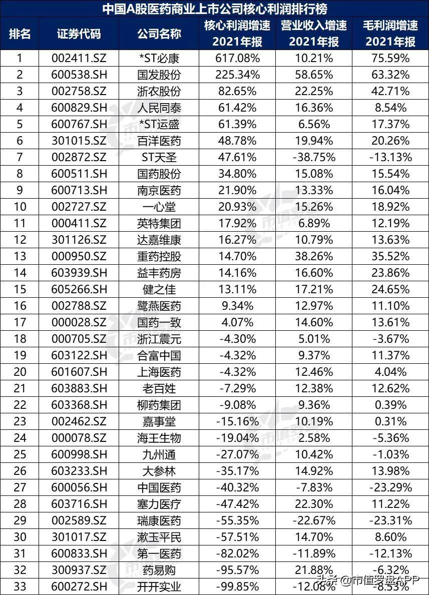 图8:中国A股医药商业上市公司核心利润增速排行榜