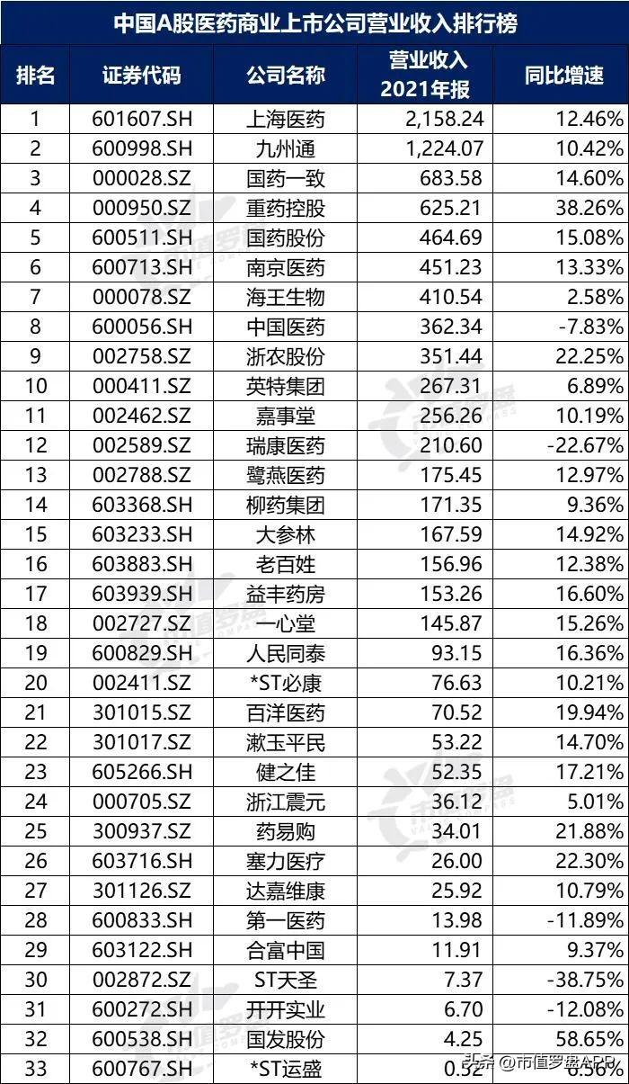 2021年中国A股医药商业上市公司榜单前三发生改变,上海医药(52.72亿元)保持排名第一,大参林(18.25亿元)代替国药一致排名第二,九州通(14.21亿元)代替重药控股排名第三。
