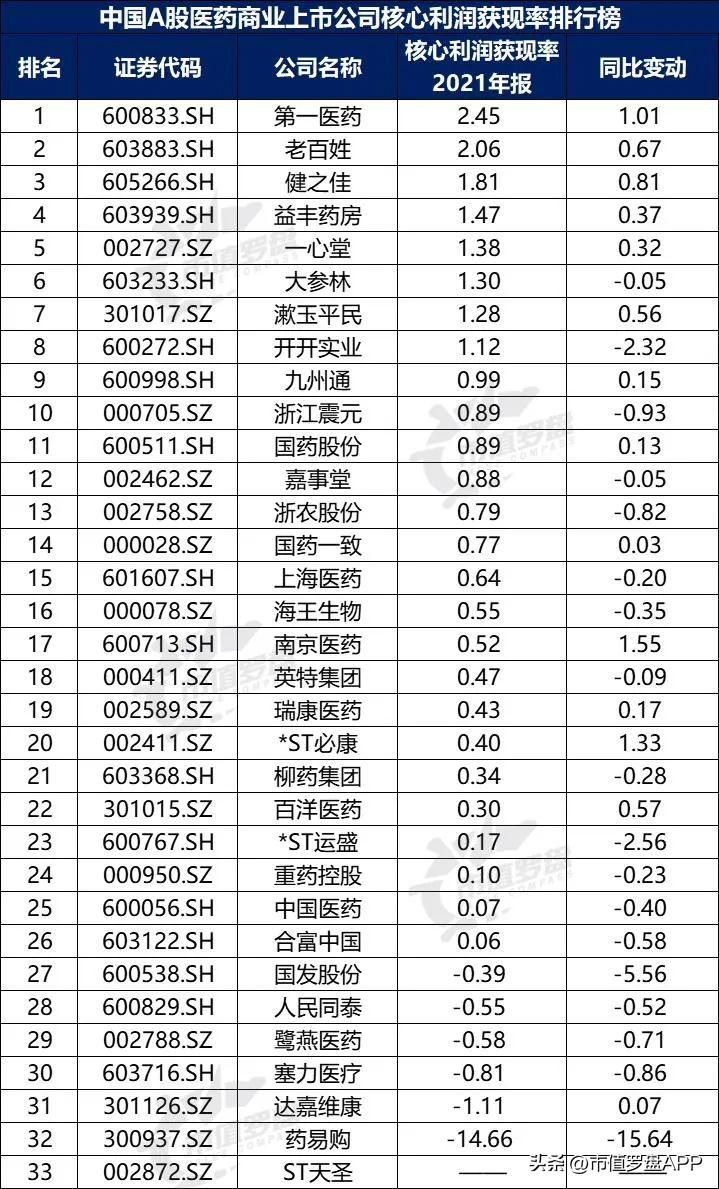 图11:中国A股医药商业上市公司核心利润率排行榜