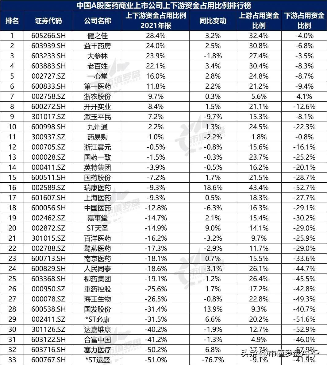 图15:中国A股医药商业上市公司上下游资金占用比例排行榜