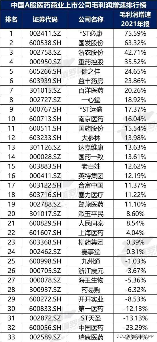 图7:中国A股医药商业上市公司毛利润增速排行榜