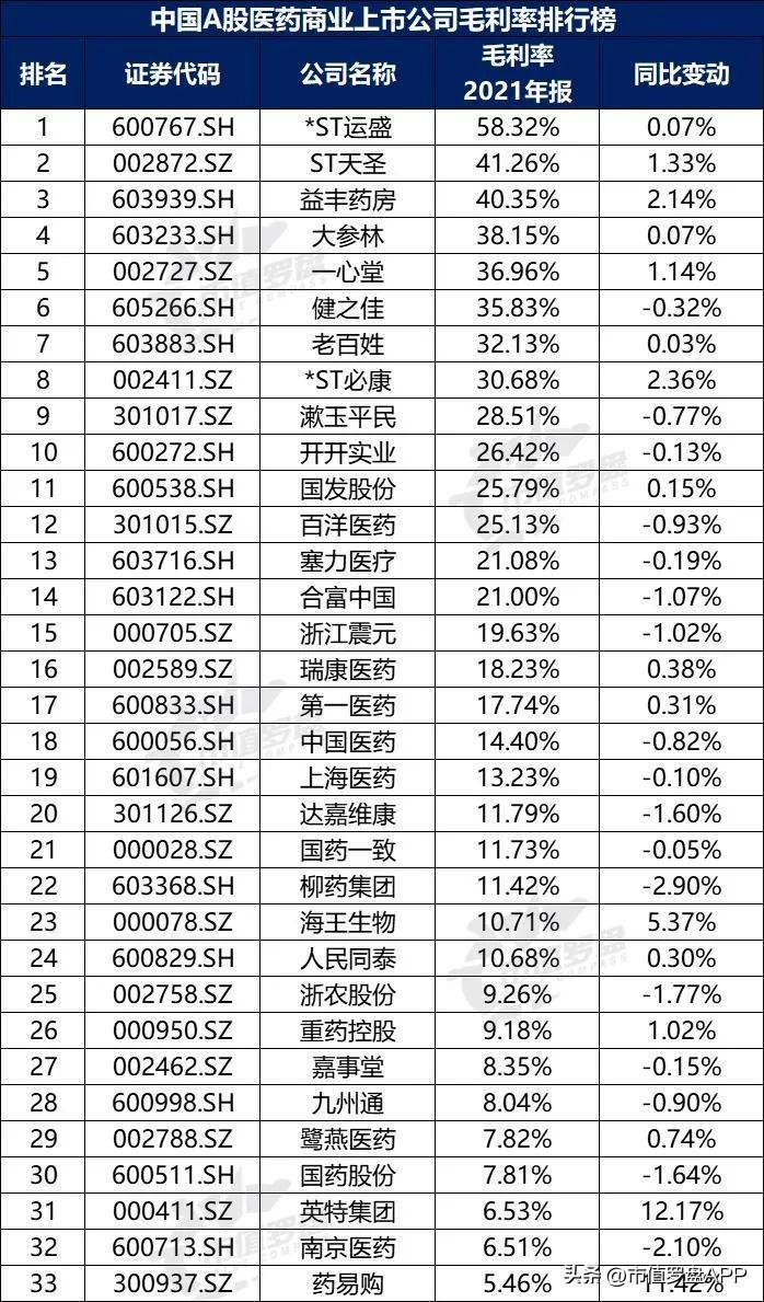 图10:中国A股医药商业上市公司毛利率排行榜