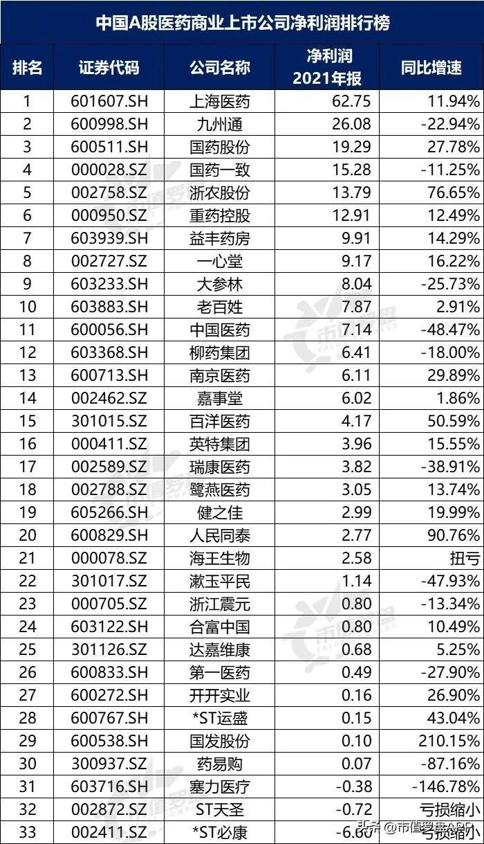 其中,1家企业净利润规模突破50亿元,3家企业亏损。榜单前三未发生改变。2021年净利润第一名是上海医药(62.75亿元),第二名是九州通(26.08亿元),第三名是国药股份(19.29亿元)。