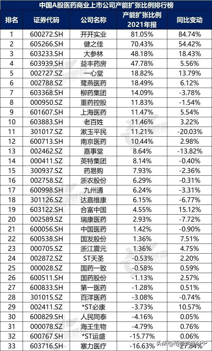 图18:中国A股医药商业上市公司产能扩张比例排行榜