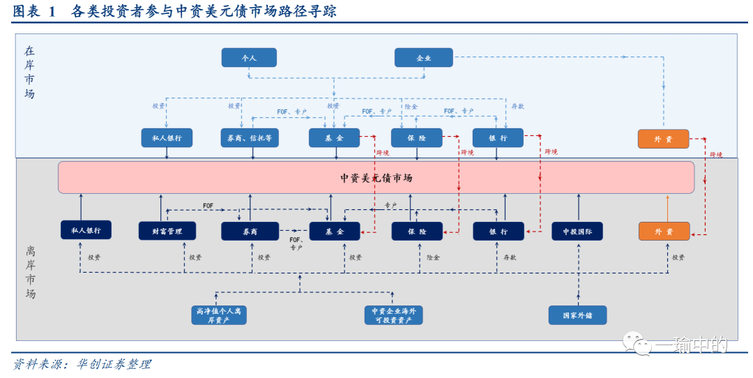 ,银行、保险、财富管理及私人银行、基金、券商乃至企业本身都是市场上活跃的投资者。面对复杂的投资生态圈,在剖析中资美元债市场上各类投资主体的持仓规模之前,先就市场参与方式做具体探讨,更有助于我们进行后续的测算。