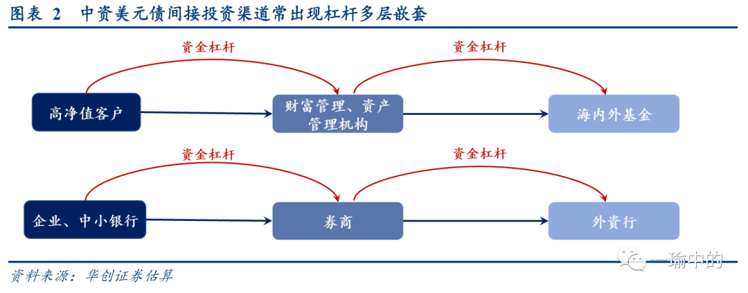 受限于出海渠道和资管能力,许多投资者选择间接投资于中资美元债市场。在此我们以三类间接投资中资美元债的路线作为例子进行分析。值得注意的是,除了银行和保险资金较为谨慎外,类似于境内理财产品,各投资主体间层层嵌套,不仅使得初始资金难以追踪,更导致杠杆叠加。