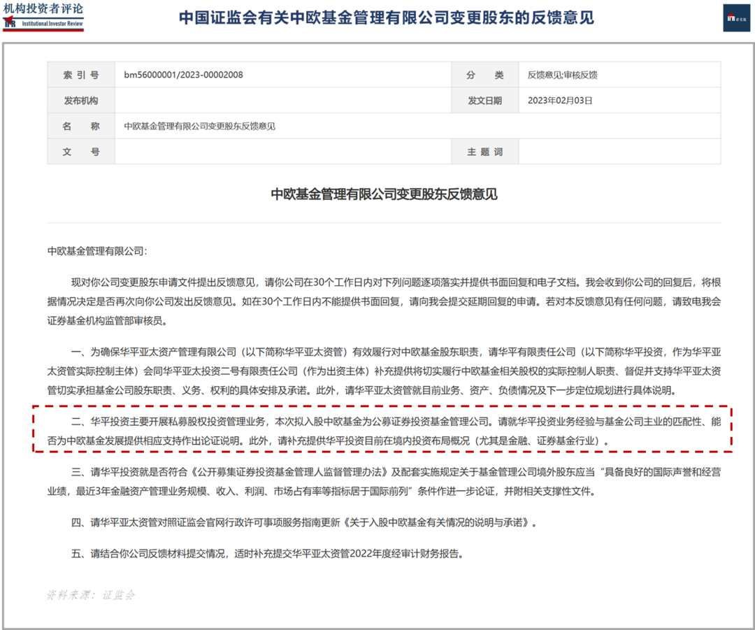 而本次证监会对于华平投资入股中欧基金的反馈意见,也意味着,华平投资与中欧基金“卖家”股东敲定合作的一年多后,距离交易达成,终于又进展一步。