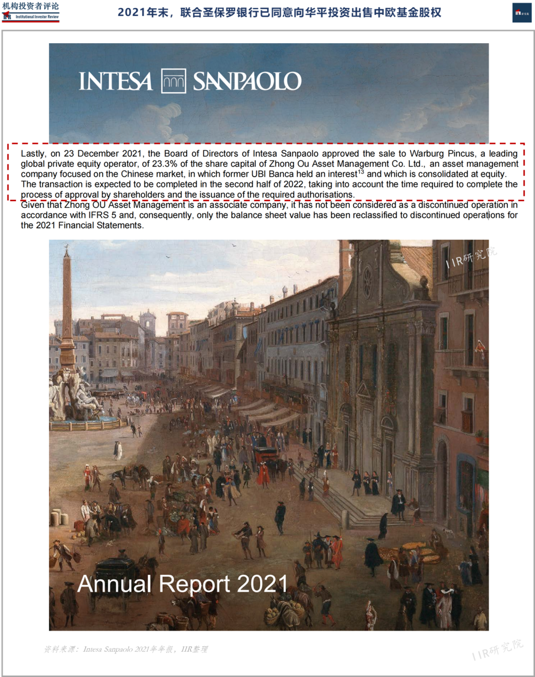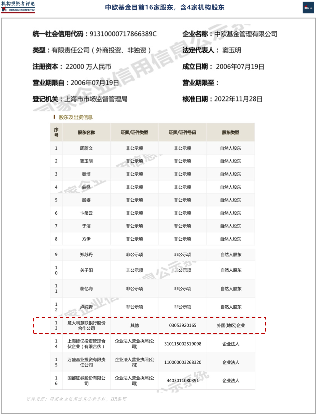 依据IIR的查询,中欧基金唯一的一家外资股东——意大利意联银行股份合作公司