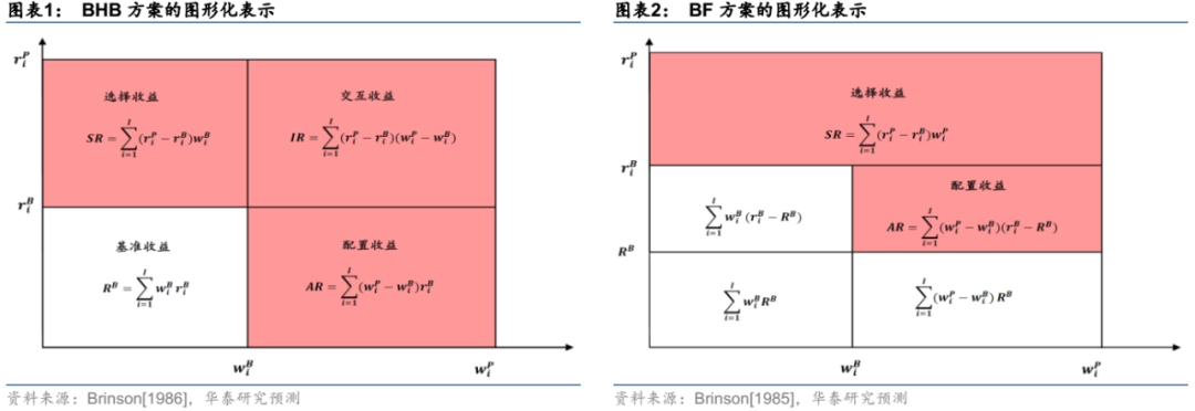 我们可以用图形来直观展示BHB方案和BF方案在收益分解时的不同,下图白色部分代表了基准组合的收益,红色部分代表了基金组合相对基准组合的超额收益,BHB方案将超额收益分解成了配置收益、选择收益、交互收益三个部分,而BF方案仅分成配置收益和选择收益两个部分。