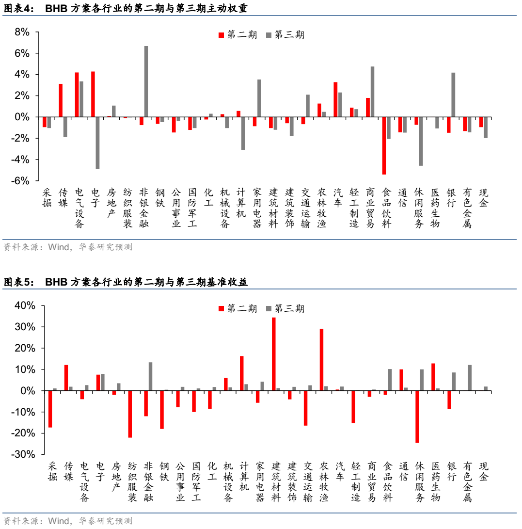 为进一步观察三期中基金在各个行业上的选择收益和配置收益,下图展示了各期各行业上的主动权重和主动收益的对比图表,并计算了三期整体的超额收益在各个行业上的分布情况: