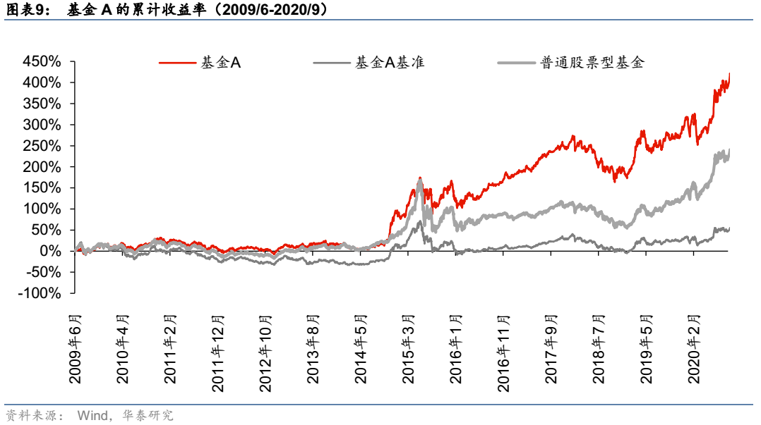 对股票型基金,我们继续使用基金A作为研究对象,其他数据处理方面的设定与前文保持一致。其中单期Brinson模型的实证时间为2020年4月1日至2020年9月30日,多期Brinson模型的实证时间与前文保持一致:第一期——2019年6月1日至2019年9月30日;第二期——2019年10月1日至2020年3月31日,第三期——2020年4月1日至2020年9月30日。基金A成立于2009年,基金历史表现优异。其比较基准为沪深300指数*90%+同业存款利率*10%。