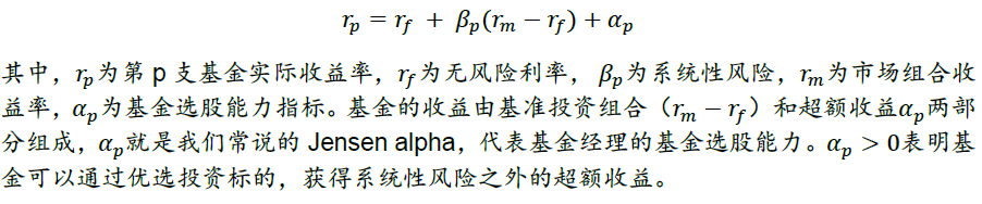 Jensen-alpha模型在CAPM模型的基础上加了一个常数项alpha,将基准的市场投资组合无法解释的收益率,全部归结于基金经理的选股能力,这个模型是后面所有基金选股择时能力评价模型的雏形: