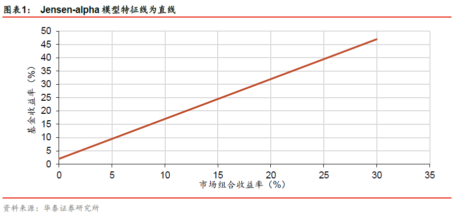 接下来我们将使用特征线对各个模型进行描述,以直观展示各个模型的逻辑和思路。特征线(characteristic line)以市场组合收益率为横坐标,以基金或投资组合收益率为纵坐标,反映基金实际收益率关于市场组合收益率的变化规律。特征线斜率等于反映基金系统性风险的贝塔。由于Jensen单因素模型中的贝塔不变,因此其特征线是一条直线。